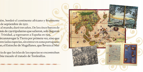 ​Se trata de paneles colocados entre las vitrinas o en sus laterales (en el caso de las dos vitrinas de mayor tamaño), así como en las cuatro caras de la columa del espacio expositivo. Carteles entre vitrinas Entre vitrinas 1 y 2: Mapa del tratado de Tordesillas   Entre vitrinas 3 y 4: Capitulaciones (1518)   Las correspondientes capitulaciones se firmaron en Valladolid, el 22 de marzo de 1518. Entre los derechos y mercedes que se concedían a los capitulantes, destacan:-La quinta parte de los derechos y ganancias que correspondiesen al rey Carlos I,-El título de gobernadores y adelantados de las tierras conquistadas y descubiertas, siendo estos títulos heredables a perpetuidad,-Podían comprar lo que quisieran en Asia y venderlo en Castilla, teniendo que pagar sólo la quinta parte al monarca de los beneficios obtenidos,-De cada seis islas que descubriesen podían escoger dos en las que no tendrían que pagar el quinto real.   Alrededor de la vitrina 4: embarcaciones de la expedición y cronología, además de una cita de Pigafetta. La expedición la componían 5 barcos y 239 hombres que salieron de Sanlúcar de Barrameda (provincia de Cádiz, España) el 20 de septiembre de 1519. La nave principal era la Trinidad, con capacidad para 110 toneladas (toneles vizcaínos) y una tripulación de 62 hombres, que iba capitaneada por Fernando de Magallanes; al frente de la San Antonio (120 toneladas y 57 marineros) iba Juan de Cartagena; la Concepción (90 toneladas y 44 tripulantes) iba a cargo de Gaspar de Quesada; la Victoria (85 toneladas y 45 tripulantes) de Luis de Mendoza y la Santiago (75 toneladas y 31 marinos) de Juan Serrano.   Cronología: 1517: Magallanes propone a Carlos I en Sevilla su proyecto de expedición para alcanzar las islas de las especias por occidente.1518: Se firman las capitulaciones de Valladolid por las que Carlos I nombra a Magallanes gobernador y adelantado de todas las tierras que descubriese.1519: Inicio del viaje de circunnavegación.1520: La expedición alcanza el estuario del río de la Plata, pasa el duro invierno en la bahía San Julián, y tras dominar un motín, se descubre y atraviesa el estrecho de Magallanes, paso natural entre el Atlántico y el Pacífico.1521: Se descubre la isla de los Ladrones (Islas Marianas) y el archipiélago de las Filipinas, a las que se pone este nombre en homenaje a Felipe II. Magallanes muere en la batalla de Mactán.1522: Juan Sebastián Elcano termina el primer viaje de circunnavegación iniciado por Fernando de Magallanes.   Entre vitrina 7 y 8, y a la derecha de la vitrina 8: listas de supervivientes.    De los más de 200 tripulantes iniciales, solo regresaron 17 hombres y el capitán, Elcano. Carteles de las vitrinas de mayor tamaño. Vitrina 9: Carlos I de España   Vitrina 10: Manuel I de Portugal   Columna. En la columna se encuentran tres paneles (lados izquierdo, interior y derecho). Lado izquierdo: Fernando de Magallanes.   Lado interior: Antonio Pigafetta. "Gracias a la Providencia, el sábado 6 de septiembre de 1522 entramos en la bahí de Sanlúcar... Desde que habíamos partido hasta que regresamos a ella recorrimos, según nuestra cuenta, más de 14.460 leguas, y dimos la vuelta al mundo entero". "Presenté a la Sacra Majestad Don Carlos V, no oro ni plata, sino algo más grato a sus ojos. Le ofrecía, entre otras cosas, un libro escrito de mi mano, el que día por día señalé todo lo que nos sucedió durante el viaje". "El miércoles 28 de noviembre desembocamos del estrecho para entrar en el gran mar, al que enseguida llamamos mar Pacífico, en el cual navegamos durante tres meses y veinte días sin probar ningún alimento fresco. El bizcocho que comíamos no era ya pan, sino un polvo mezclado con gusanos, qu habían devorado la sustancia y que tenía un hedor insoportable por estar empapado en orines de rata. El agua que nos veíamos obligados a beber era igualmente pútrida y hedionda. Para no morir de hambre llegamos al terrible trance de comer pedazos del cuero con que se había recubierto el palo mayor para impedir que la madera rozase las cuerdas. Este cuero, siempre expuesto al agua, al sol y a los vientos, estaba tan duro que había que remojarlo en el mar durante cuatro o cinco días para ablandarlo un poco, y enseguida lo cocíamos y lo comíamos. Frecuentemente quedó reducida nuestra alimentación a serrín de madera como única comida, pues hasta las ratas, tan repugnantes al hombre, llegaron a ser un manjar tan caro, que se pagaba cada una a medio ducado.”“Mas no fue esto lo peor. Nuestra mayor desdicha era vernos atacados de una enfermedad por la cual las encías se hinchaban hasta el punto de sobrepasar los dientes, tanto de la mandíbula superior como de la inferior, y los atacados de ella no podían tomar ningún alimento. Murieron diecinueve, entre ellos el gigante patagón y un indígena de Verzín que iba con nosotros.” Lado derecho: Juan Sebastián Elcano.
